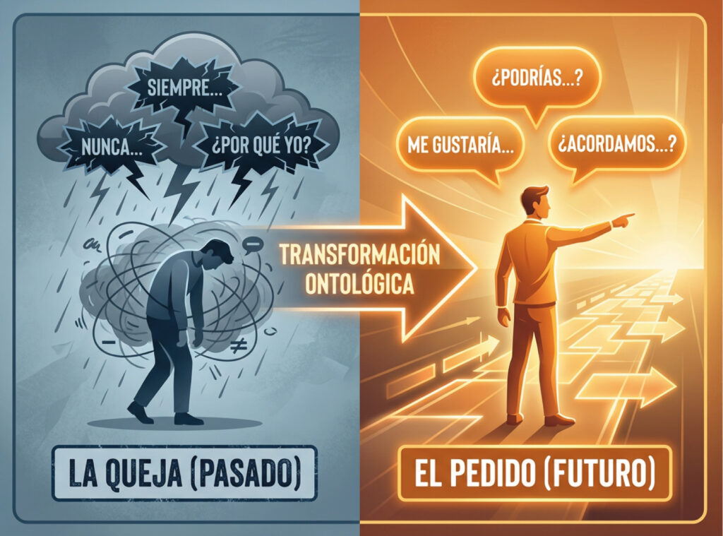 La queja es pasiva y mira hacia atrás. Frases como “siempre dejas todo tirado” o “nunca me escuchas en las reuniones” te mantienen en un rol de víctima y drenan la energía de cualquier vínculo.